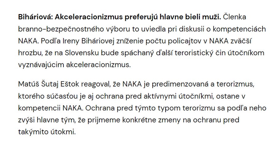 To čo myslí Irena Bihariová pod akceleracionizmom je len bububu termín pre veľmi starú taktiku (nie ideológiu) politického extrémizmu a terorizmu, ktorú aplikujú mnohí - od rôznych anarchistov, cez Hamas, až po náckov - chcú urýchliť samodeštrukciu nepriateľa, tým že ho vyprovokujú k prehnanej reakcii a opusteniu vlastných hodnôt. Teda chcú napríklad akcelerovať a zintenzívniť etnické a rasové napätie.